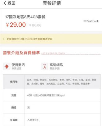 走芯SIM基本上就係大陸版既自由鳥或者Airsim.   同其他日本sim 卡最大分別, 係張卡只要買1次, 張卡係可以循還再用.  唔洗掉左佢.  只要用個陣俾錢, 可以一路咁 keep 住張sim 卡. 佢support 好多唔同國家. 你只要download 左佢手機app, 係有講每個國家每一日係幾錢.  好似最大路既8日plan.  日本同好多個國家都用到.  你見下圖, 係29蚊人仔, 就可以有4GB 用8日, 過左limit 跌落128kbps 龜速.   價錢好明顯係仲平過 AIS Sim2fly, 經手機app 俾左錢就用得.