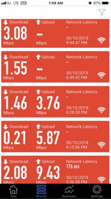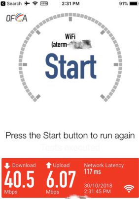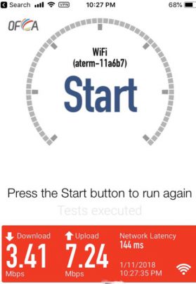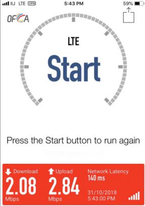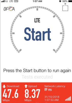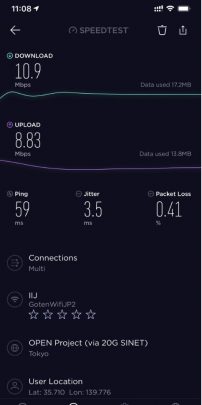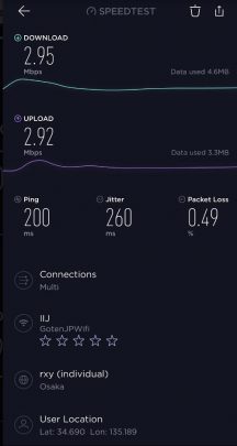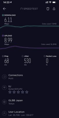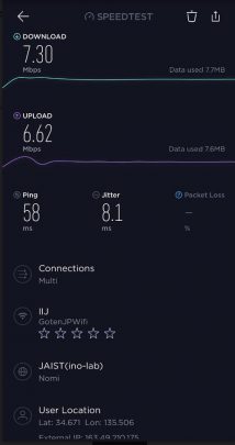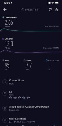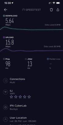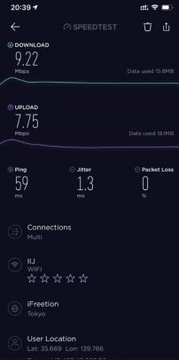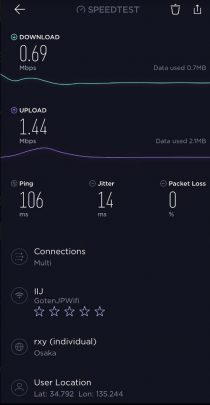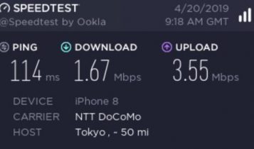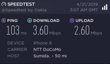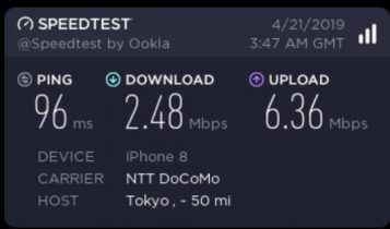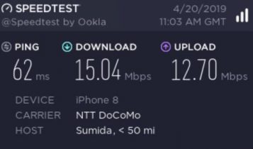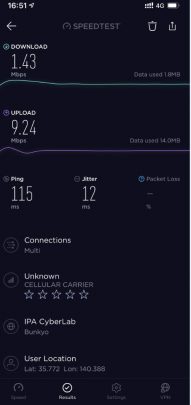 因為出品係IIJmio, 唔算係大品牌, 所以download speed/upload 可以大上大落, 人多或者peak time 可以好大差別. 下面大部份慢嘅speed test, 都係中午到下午時間. 慢個陣亦可以跌落3Mbs 以下. 而係off peak time 係快到可以80mb/s 以上. 不過佢最大優勢係用日本 IP, 同ping 值超低, 而且超多data, 打機同自駕遊就好啱用. 不過要注意嘅係, 呢張卡係京都用係特別差. 如果要去京都嘅話, 唔好用呢張卡 (睇回報 #57)