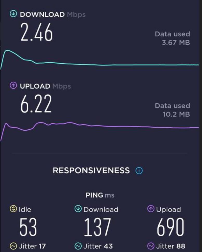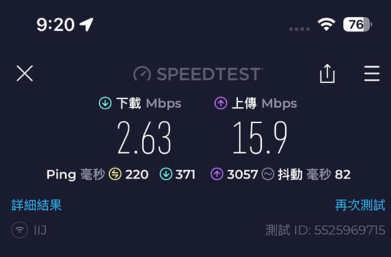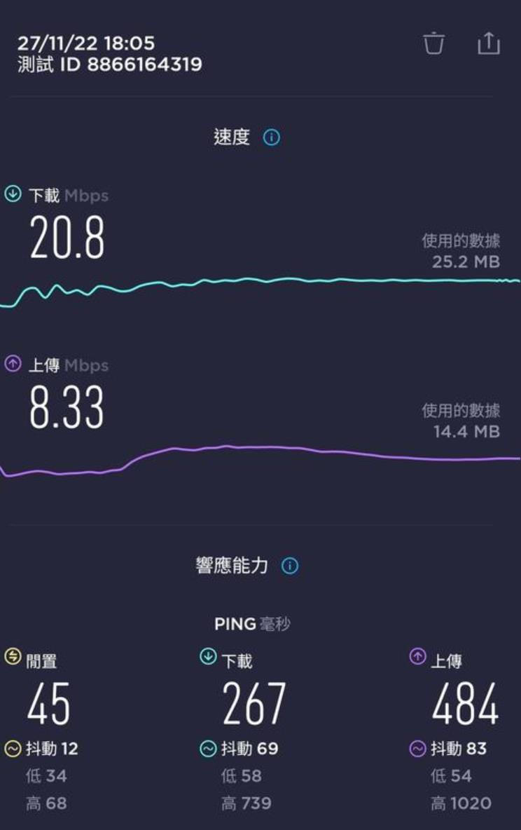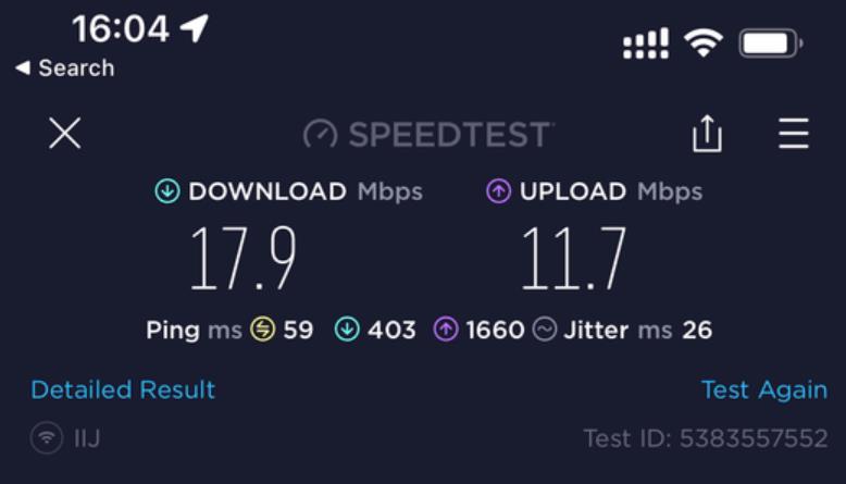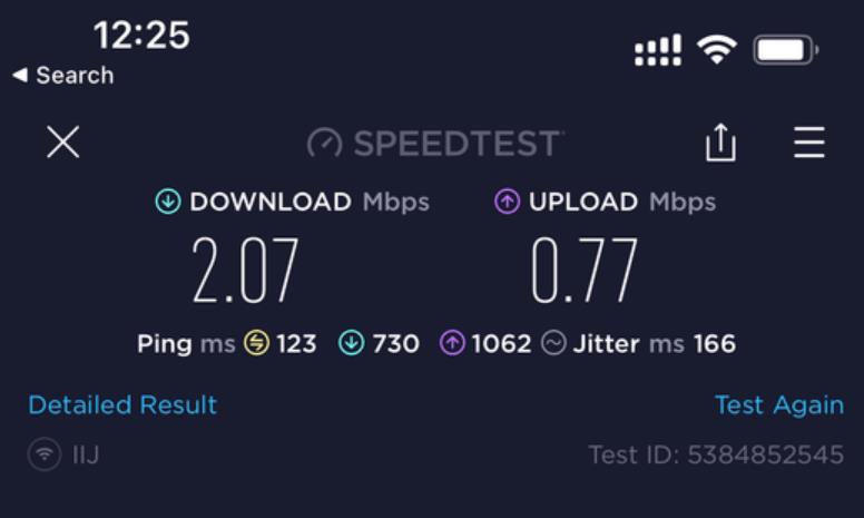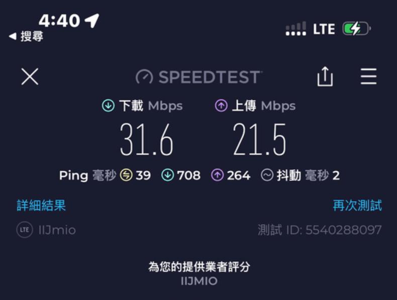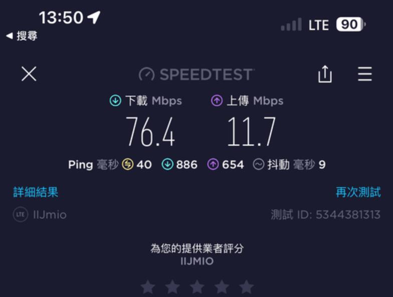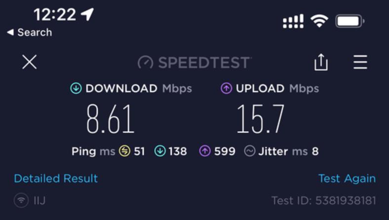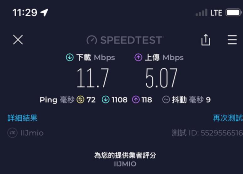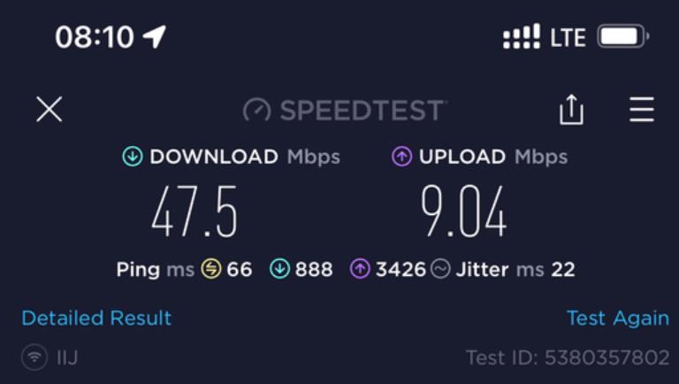 呢張卡我有2個用途, 主要係要黎當後備 data尿袋用 + data 速度唔係考慮範圍內, 同自駕個陣用. 即係我有另一張主卡係速度好好不過data 唔多. 呢張IIJmio卡係插左係我私人買嘅齋機Docomo U50 5G wifi 蛋內. 我9成時間都係駁住呢隻wifi 蛋亂咁用. 因為data 多. 當我突然有一刻需要data 快速嘅話, 我會斷wifi 用電話內另一張主卡嘅data. (我平時去日本都係必定一張快速但data 少嘅主卡 + 一隻大量data 嘅後備wifi 蛋, 2個人用.) 因為 IIJmio 張卡得2個特點, 就係多data 同低ping. 速度唔係佢嘅優點黎.